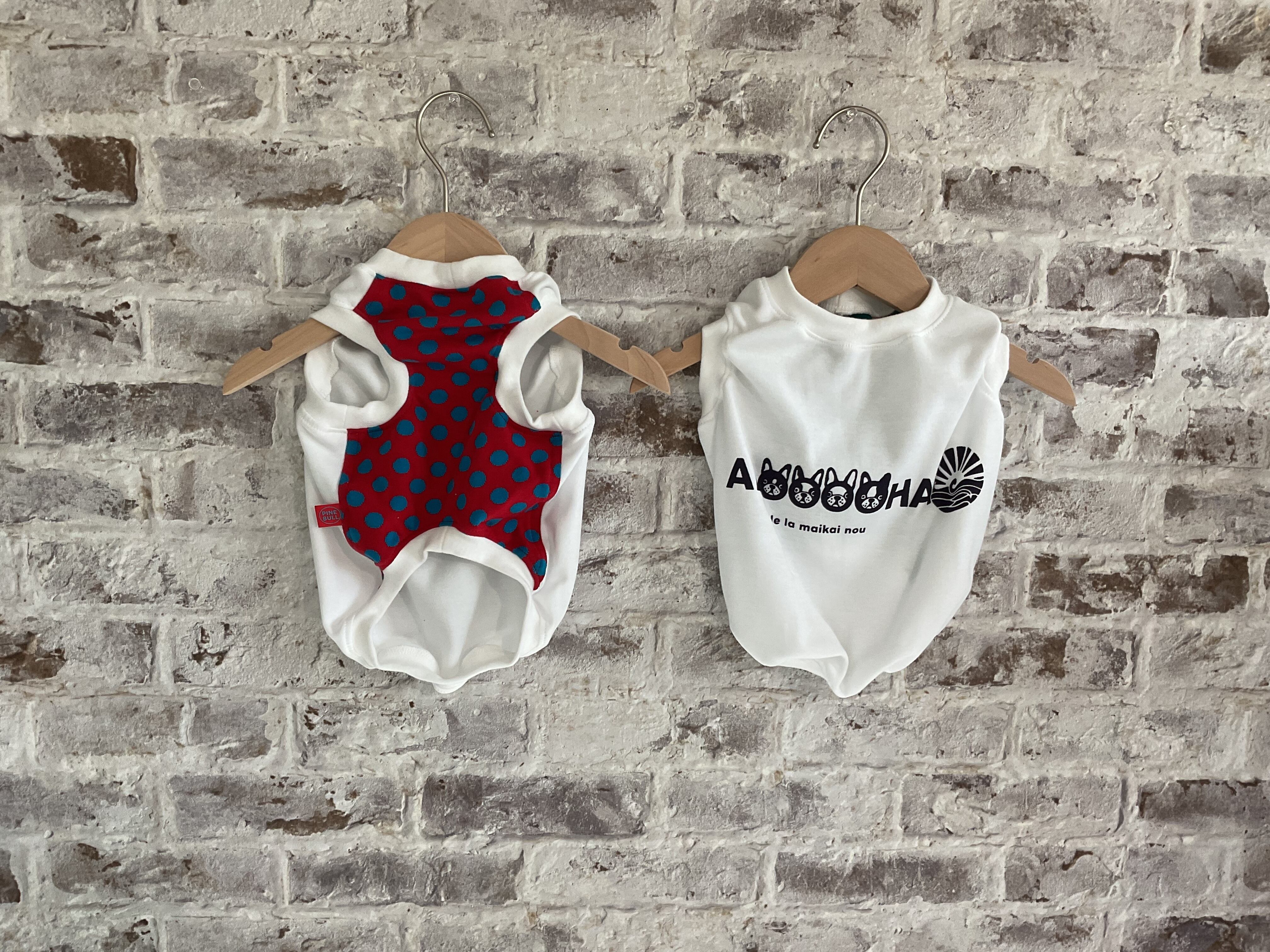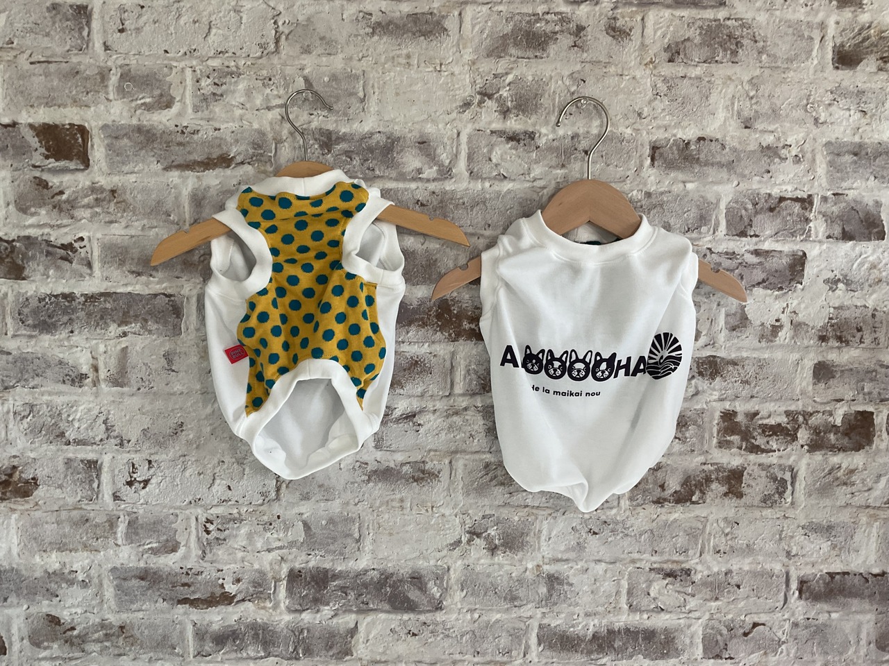 夏らしく、肌触りの良いスムースニットの白地に、お腹側はお決まりのカワイイうつ伏せ